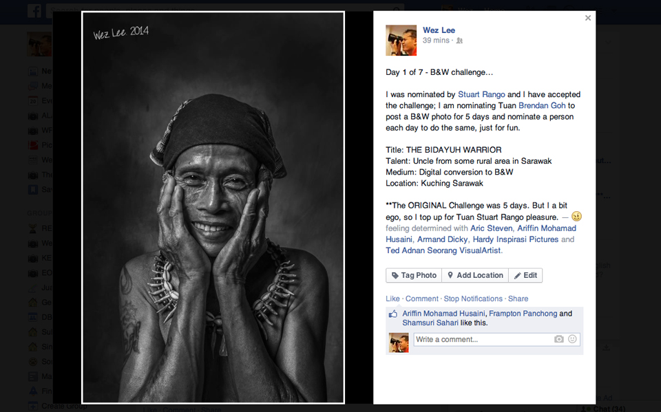Here are the screen shot of my Facebook posting. To follow my B&W challenge 7 days posting, just LIKE my page,[ Wez.photoworks ] on Facebook.